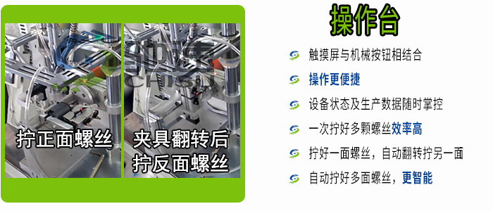 翻轉式自動打螺絲機是在固定臺面上設計一個可以轉動的夾具,通過夾具轉動來鎖付產品正反兩面的螺絲,一臺設備可達到雙倍固定式鎖螺絲機的效率,適合多面螺絲鎖付,詳細操作可查看網站底部的視頻。